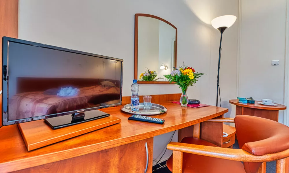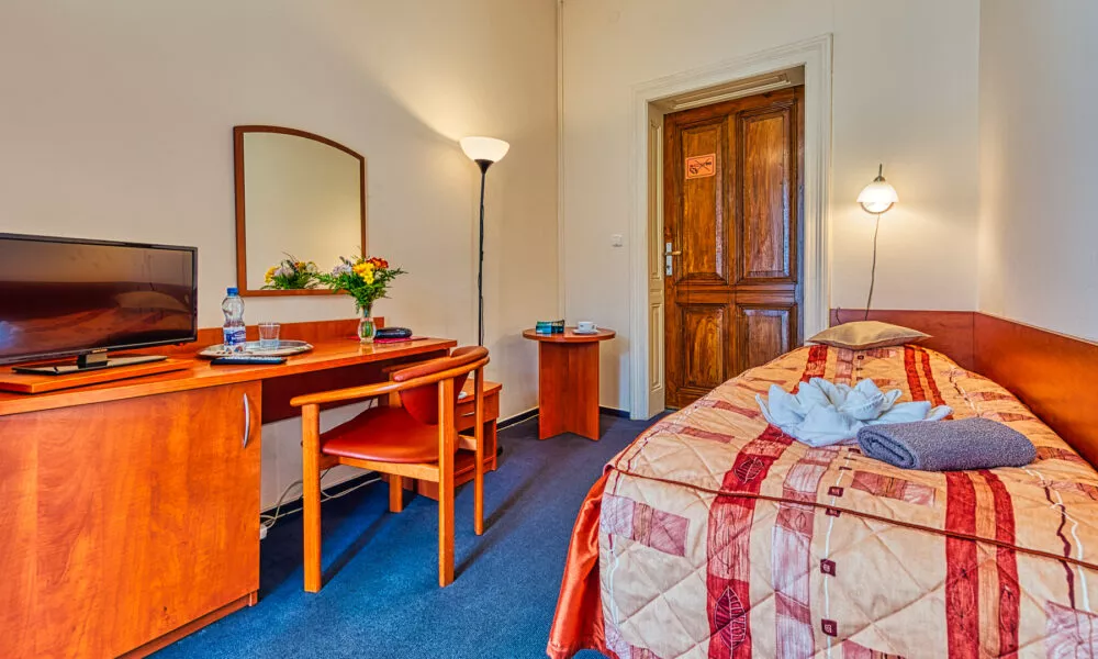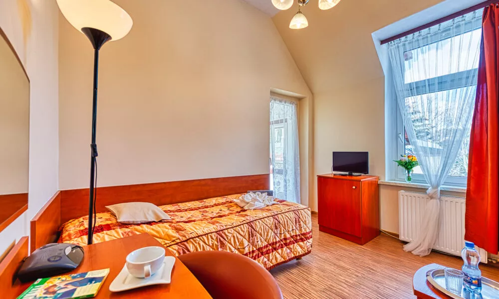 Znajduje się w nim pojedyncze łóżko oaz telewizor z dostępem do kanałów satelitarnych. Łazienka wyposażona jest w prysznic, umywalkę oraz suszarkę.